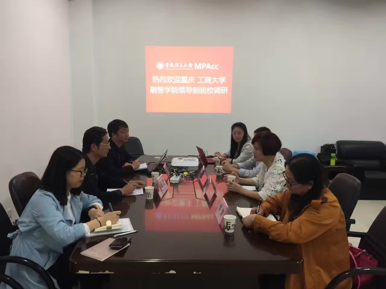 (会计系 王婧婧)2016年10月9日,受重庆理工大学MPAcc教育中心执行主任程平教授的邀请,我校会计学院学术带头人章新蓉教授、会计学院谢付杰院长、会计学教研室主任罗萍老师、王婧婧老师一行到重庆理工大学会计学院进行参观,并就重庆理工大学会计信息化本科人才培养和“互联网+会计”MPAcc复合型会计人才培养等进行密切交流。重庆理工大学会计学院党总支书记阎建明副教授、会计学院会计信息化系邱杰副教授出席会议。
