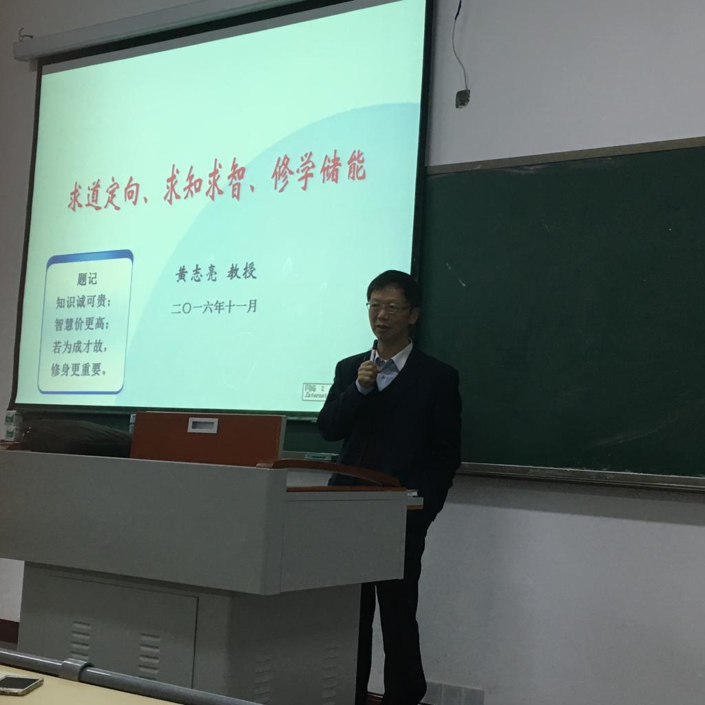 讲座伊始,首先由刘伟博士致欢迎辞,对黄志亮教授的到来表示欢迎,并向同学们介绍了黄教授的相关情况。随后,黄志亮教授以“求道定向、求知求智、修学储能”为主题,从问道为首、导航定向,追求知识、追求智慧,职业技能、学术技能、综合素质协调发展,智者不惑、仁者不忧、勇者不惧,继承民族精华、创造新知识6个方面为学生指明专业学习方向,开阔了同学们的视野,发掘了同学们的学术兴趣。黄教授谈古论今,用丰富的案例为大家剖析了城市管理专业的发展背景和趋势,对同学们如何学好专业知识,提升专业技能以及做人做事提出要求。现场同学们认真聆听同时做好记,并在互动环节踊跃发言,就学习过程中的困惑和职业规划提问并认真听取了教授的观点和见解。