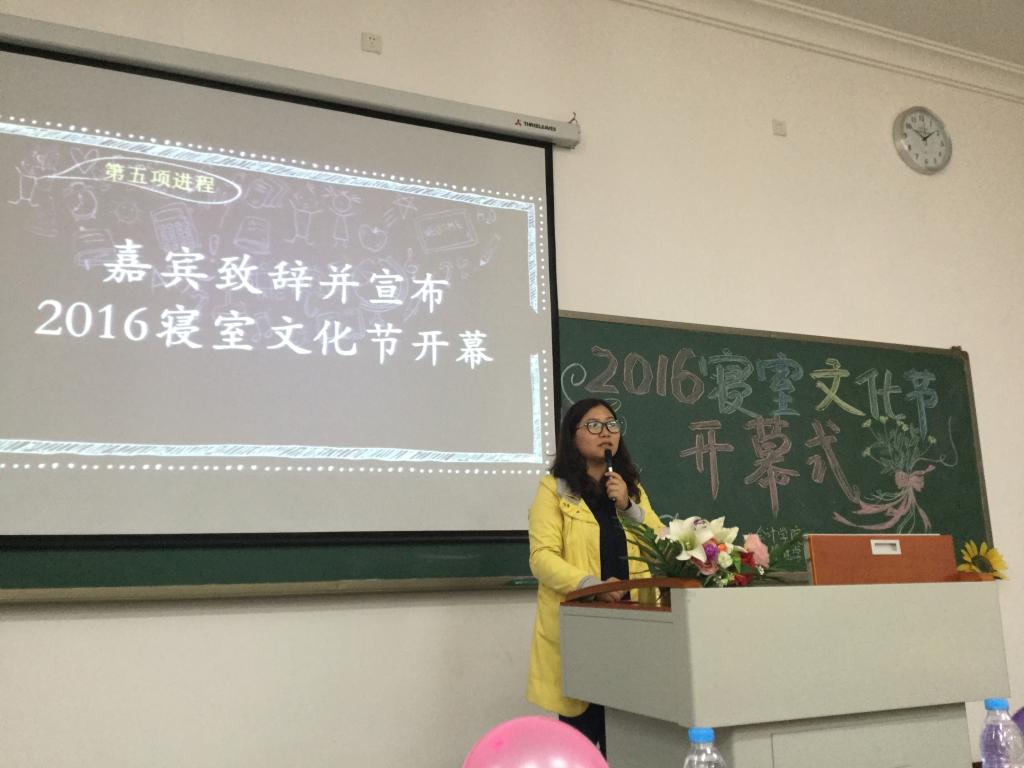 在主持人简短的开场白后,一段2015年寝室文化节的精彩瞬间回顾的视频映入了大家的眼帘,犹见视频中的学长学姐们个个都活力四射,斗志昂扬,不禁感染了参与这届寝室文化节的小伙伴们。紧接着,是由会计学院学生会生活部部长杨晓梦为同学们介绍本次活动的一些相关情况和说明,此次寝室文化节共分为四个板块:有增强寝室成员团结协作能力的融智大富翁游戏;有培养审美情趣的手艺大比拼;有利于同学们营造干净舒适的学习和生活环境的寝室文明卫生评比;有展示寝室团队成员风采的才艺秀。随后,各个参赛寝室也都纷纷上台介绍了自己所在寝室并发表了参赛宣言。最后,学生处处长唐川川做了讲话并宣布正式开幕。唐处长强调学校高度重视寝室文化建设,希望同学们在此次活动中不仅发挥自己的聪明才智,也要培养团队意识,增进同学间的友谊,并衷心预祝本次寝室文化节取得圆满成功。