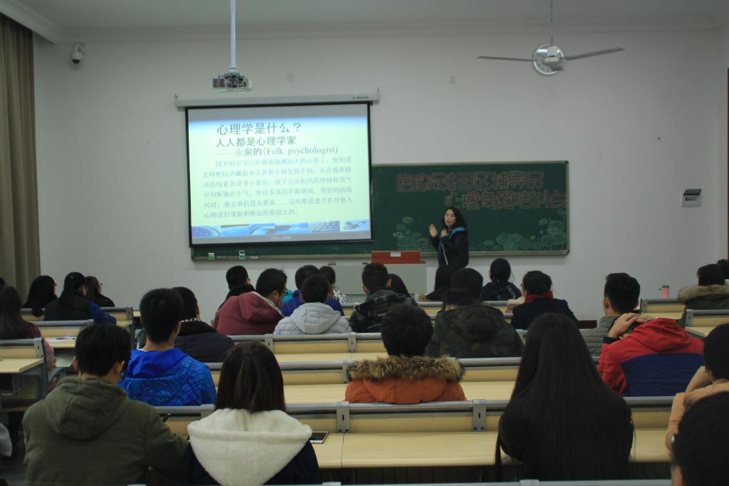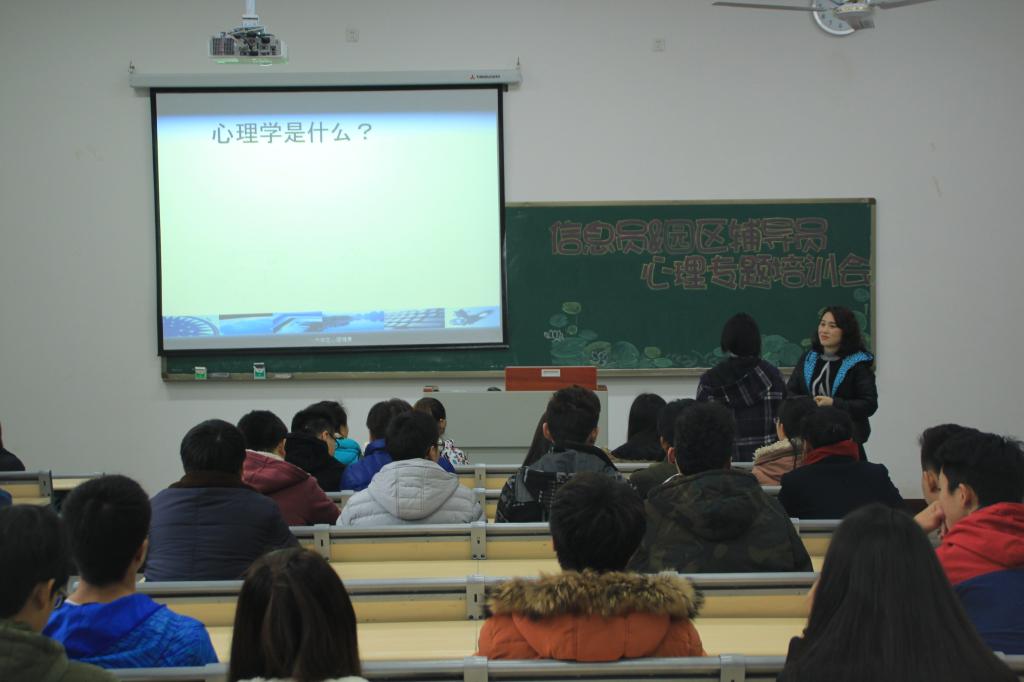 (通讯员 杜青林)12月15日中午,我校学生处在教学楼1406教室举办了学生信息员及园区辅导员心理专题培训会,各园区辅导员以及2015级、2016级全体学生信息员参加了此次培训会。此次会议由学生处李英老师主讲,旨在解开“心理学是什么”、“去做心理咨询的人都是有心理疾病吗”、“到底怎样才是心理健康”这三大方面的疑惑。