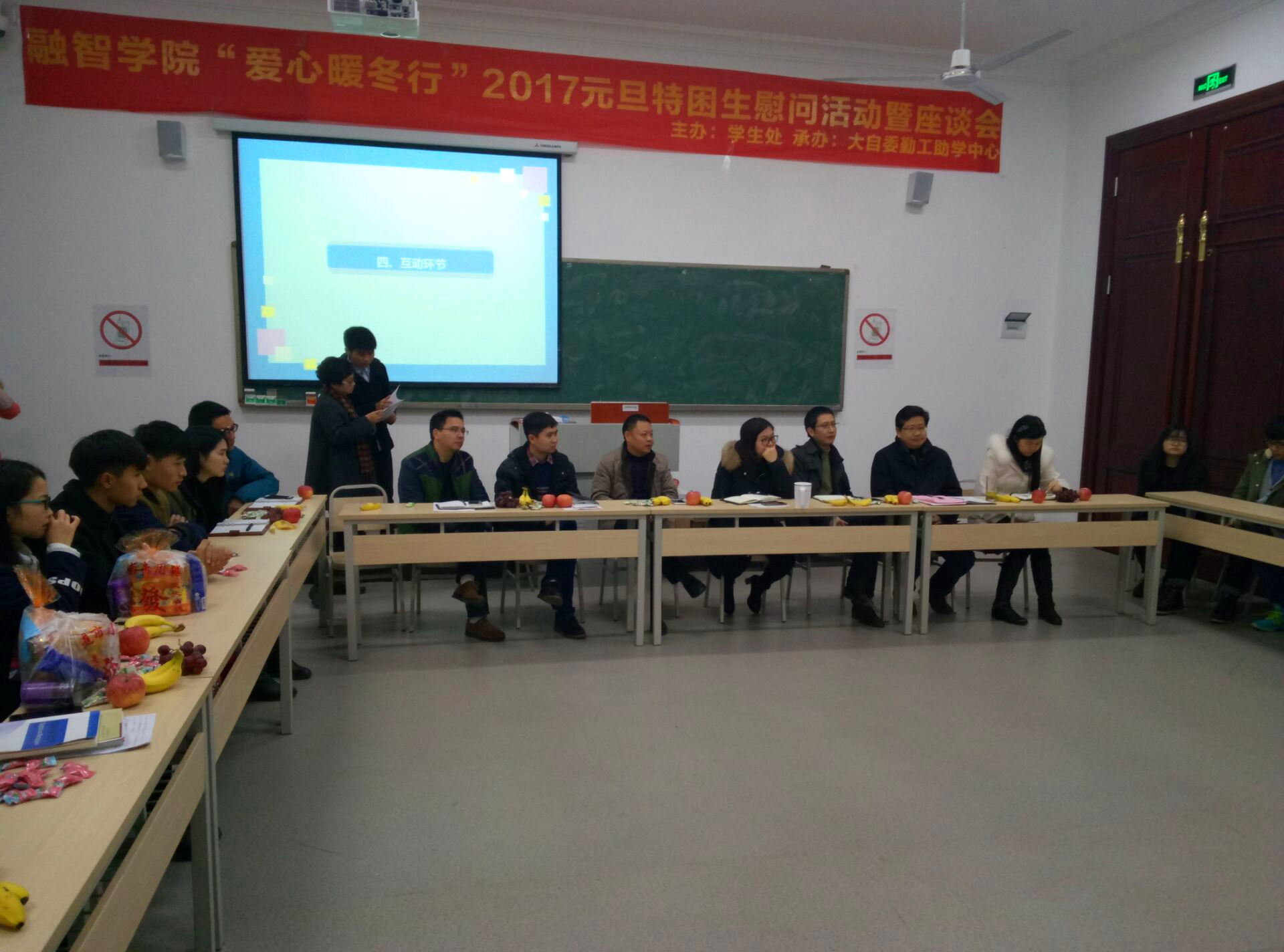 (通讯员 熊森)为进一步了解学校贫困生的学习生活状况,在寒冷冬日为他们送去关心和祝福,我校于2016年12月23日上午10:00在教学楼1518教室开展了“爱心暖冬行”特困生慰问活动暨座谈会。校党委副书记陈龙国、学生处处长唐川川、学生处副处长兼团委书记李刚、财富管理学院党总支副书记莫险峰、经济学院党总支副书记乐晓勇、信息工程学院党总支副书记叶远帆、金融学院党总支副书记陈萍、商务学院徐繁生老师、会计学院谭白冰老师受邀参加此次座谈会。