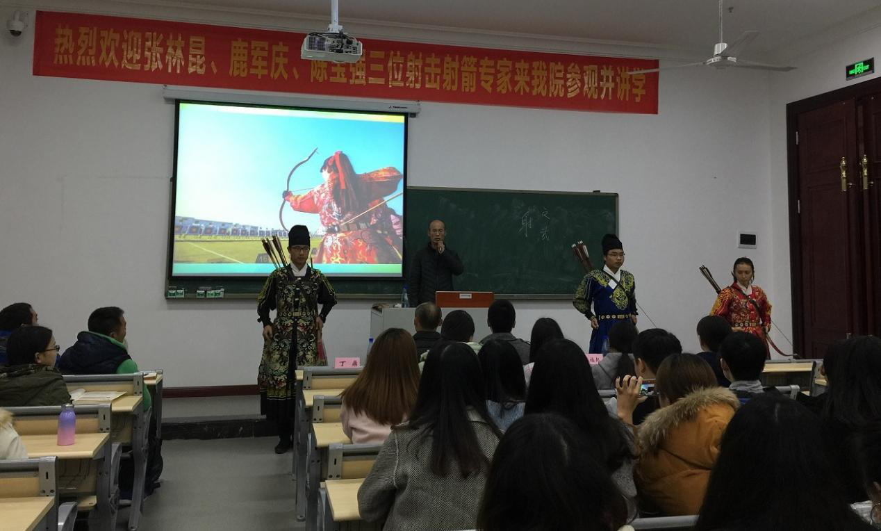首先张科长介绍了国家对射击射箭项目的政策支持,重庆市大学生射击射箭赛事及全民健身计划等情况。之后鹿教练讲解了竞技体育的特点,特别是射箭的规范,比赛标准。以真人示范的方式从站立、举弓、开弓、瞄准、加力、撒放六个方面详细讲解了射箭的动作要领、技巧和准确度的训练方法。从实例出发,介绍了射箭的基本功训练的重要性和射箭的乐趣。最后,陈博士围绕世界弓箭文化、中华弓箭历史、射艺文化体系、射艺课程建设、射艺方法、射艺体验等方面讲解了射箭的灿烂辉煌文化,并结合自己带来的射箭服饰和弓箭,真实展示,让听讲师生深刻体会了射击射箭的健康功效和卓越的教育价值。