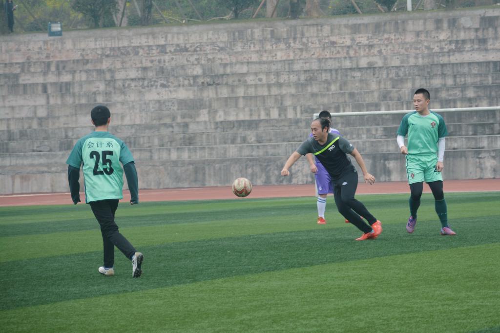 比赛前,会计学院各位队员换上了他们的绿色战衣,各位老师也穿上了自己的球服,不得不说,当他们换上运动服的那一刻,好像跟学生们一般年龄大小。做好准备活动之后,比赛拉开帷幕。比赛伊始,双方都比较保守,处于试探性阶段,你来我往,随着双方对对手球风的渐渐了解,剖析对手的排局布阵之后,比赛愈加激烈,双方球员渐入佳境,不时打出精妙的配合和有攻击性的射门。教师队的老师脚下功夫了得,无论是抢球、传球,还是射门,都气势不凡。当然会计学院足球队也不甘示弱,凭借着自己时常训练出来的技术,和充沛的体力,与教师队卯足劲儿比拼。经过半场赛事的激烈角逐,终于到了中场休息时间,小记者们走到队伍中间,采访了一位老师,据老师介绍,以后的每一个周五,他们都会和来自不同院别的足球队pk,这不仅是有助于身体的锻炼,还可以拉近师生距离,通过比赛的方式和同学们增进师生情谊。