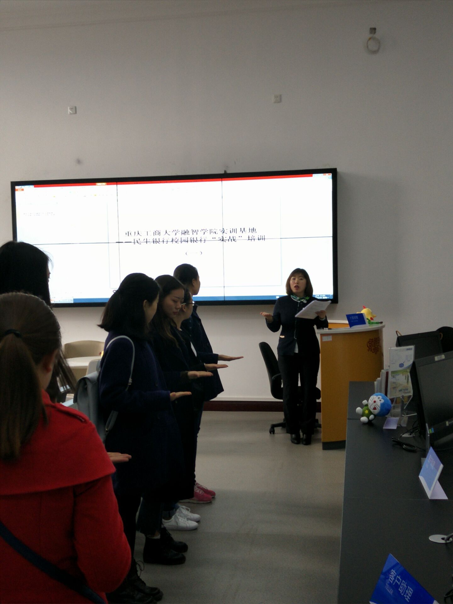 不用走出校园,能穿上漂亮的制服,在全国性商业银行担任“行长”……这一切将会发生在我们身边。为将课堂教学与实践工作相结合,建立校园实验实训基地,培养金融银行业应用型人才,我校与民生银行合作开办了民生银行融智校园银行。2017年3月20日上午10:30,民生银行巴南支行的两位客户经理王沁雪与邹晓燕,对首批参与实训的10名“员工”,在1219金融综合实训教室进行了首次岗前培训。而这10名“员工”,正是来自我校金融学院14级金融学专业和信用管理专业的同学们。