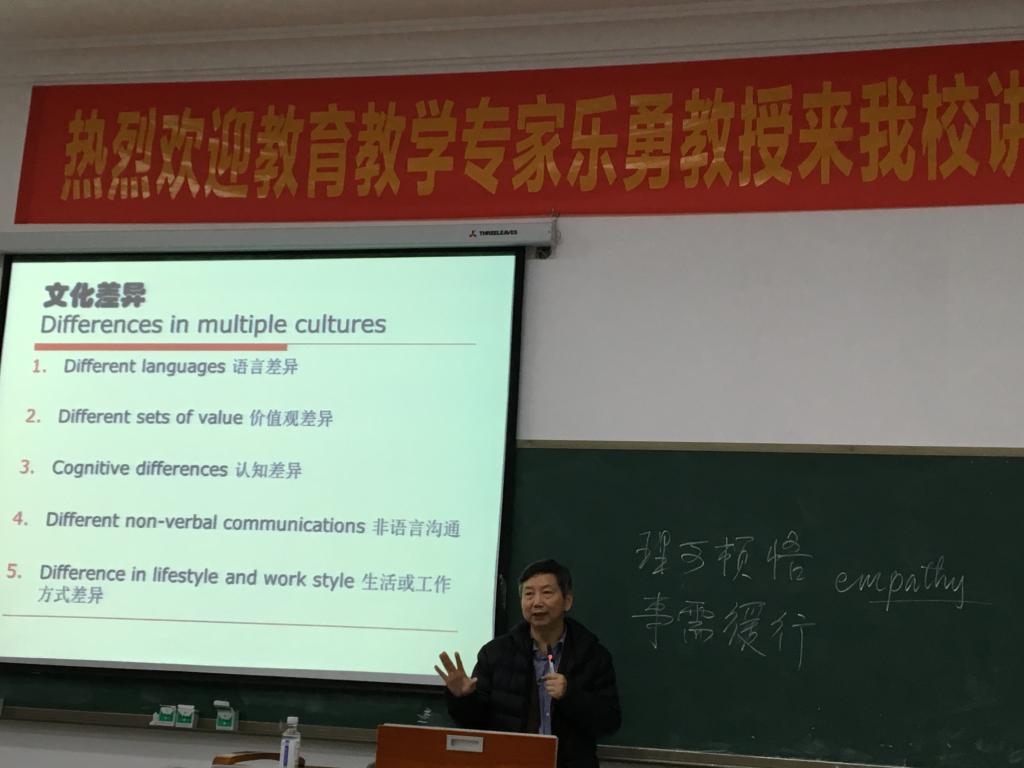 为拓宽我校师生的国际交流视野,培养师生跨文化交流的意识和能力。2017年3月24日,基础课教学部邀请重庆市教育国际交流协会乐勇教授(曾任四川外国语大学党委委员、副校长、重庆市中外合作办学评审专家)在1506教室举办了跨文化交流能力建设的讲座。我校国际交流合作处石转转处长、商务学院张红梅院长、财富管理学院赵娜副院长、基础课教学部英语教师、商务学院专业教师和商务学院部分2015级、2016级学生应邀参加,本次讲座由基础课教学部吕福起副主任主持。