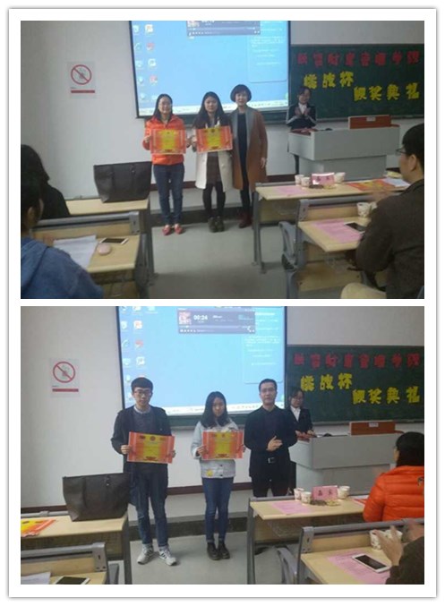 本次活动由三个环节组成。第一个环节是教师座谈会,指导老师们就“挑战杯”竞赛过程中的指导心得与感想进行了交流,同时从大赛宣传以及指导过程等方面出现的不足提出了中肯的意见。第二个环节是颁奖典礼,教师座谈会完后,全体参赛学生入场,颁奖典礼正式开始,在老师们逐一为获奖团队颁奖,之后学术带头人章教授进行了讲话,她在讲话中肯定了师生们的辛勤付出,并对同学们提出了殷切希望,希望同学们抓住挑战杯的机遇,珍惜老师指导的机会,主动跟老师联系,在不断改进中提升自己。第三个环节是学生座谈会,座谈会上各参赛队分别派代表畅谈“挑战杯”的收获并提出了宝贵的建议;副院长赵娜、党总支副书记莫险峰、学团办副主任宋钰静分别就同学们的建议进行回复,强调参与“挑战杯”既可以提升自己科研能力,同时对以后考研、就业有很大帮助。在参与的过程同学们虽然很辛苦,但无形中却收获更多知识,并希望同学们勇敢尝试,不断挑战,总结经验,积极营造学生科技创新的浓厚氛围,在下一届比赛中能有更大收获。