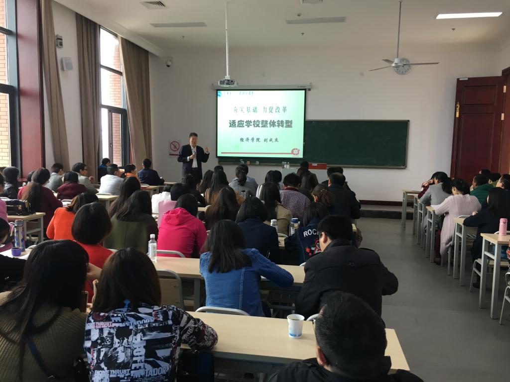 为进一步推动学校整体转型,帮助学校教师找准定位,促进教育教学改革。3月31日上午9时,重庆工商大学教学指导委员会副主任、我校经济学院学术带头人刘成杰教授应邀前来,在1314教室举办了以“促进基础 力促改革,适应学校整体转型”为题的专题讲座。学校教师发展中心副主任李倩,以及全体专职教师参加了此次讲座。
