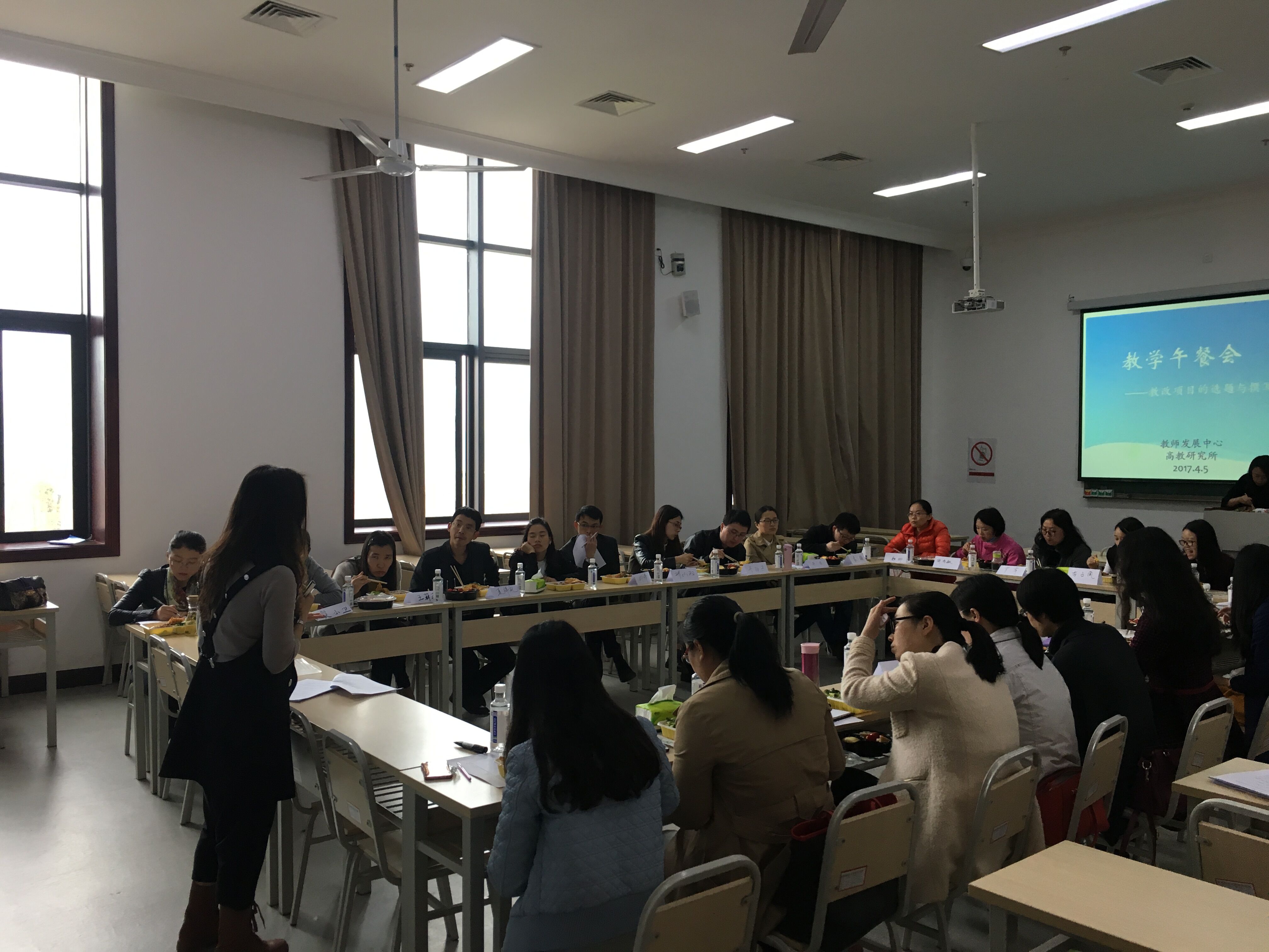 2017年4月5日中午12:00,我校教师发展中心和高教研究所在教学楼1314教室共同举办主题为“教改项目的选题及撰写”的教学午餐会。教务处滕学英副处长、教学发展中心副主任李倩、高教研究所副所长尹丽及24名学院职工参加了此次活动。