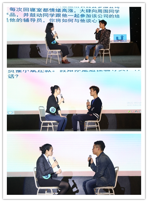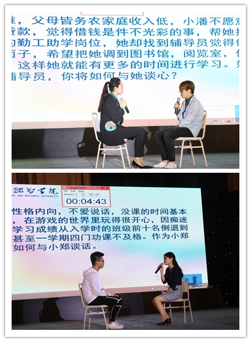 在大赛进行的谈心谈话环节,参赛老师现场抽取题目,通过情境再现的形式,与学生进行面对面交流。参赛老师们机敏灵活的处事能力,再搭配上学生们幽默积极、精彩绝伦如“影帝影后”一般的表演配合,令现场笑声不断、前俯后仰,赢得了台下热烈的掌声。