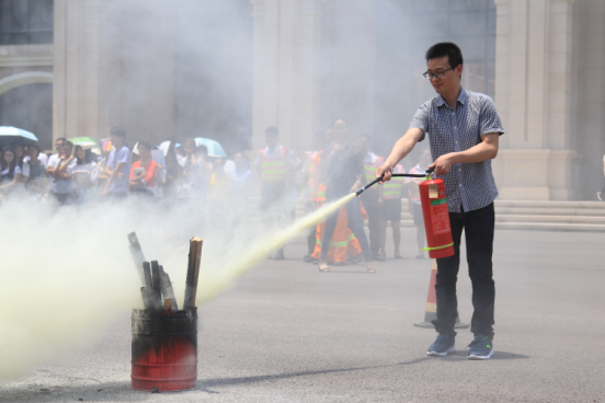 演练进入到第九个议程,进行室外灭火实践。现场专业人员讲解了使用灭火器、水枪水带的方法和步骤,并进行现场演示。演示结束现场的教职工和同学们亲自体验了使用干粉灭火器将火扑灭的过程。