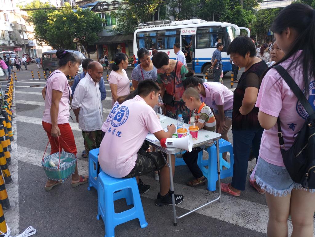 在招募中,团队成员一部分设点地介绍和进行信息记录,另一部分同学在街道游行宣传,热情地为居民介绍将于明天开展的授课活动支教活动受到了当地居民的热情欢迎,很多家长带领孩子前来报名,并对服务团的支援奉献行为表示赞赏