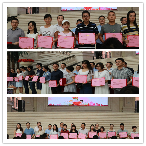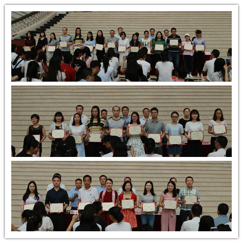 大会共十个议程,陈龙国副书记宣布会议开始,全体教职工庄严肃立,奏唱国歌。随后,沈民副校长宣读《关于表彰2016—2017学年度重庆工商大学融智学院优秀教师、优秀教育工作者的决定》以及《关于表彰2017年工龄满10年教职员工的决定》;李春雷助理宣读《关于表彰获得2016-2017学年“教学优秀奖”的教师的决定》;房朝君助理宣读《关于表彰2016年度教师讲课比赛及2017年度新进教师教学技能比赛获奖教师的决定》。台上领导为获奖老师们颁奖并表示祝贺。这是对获奖老师们辛勤工作的肯定,也是对全体教职工认真工作、致力于教育事业的激励。