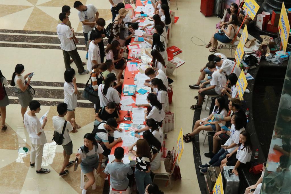 九月,踏着荫凉,新一年的迎新工作如火如荼地进行着。9月8日中午我校2017级校迎新工作在教学楼二楼大厅正式展开。今天,是迎新的第二天,迎新志愿者们全身心投入到工作中,用最饱满的热情欢迎学弟学妹们的到来。