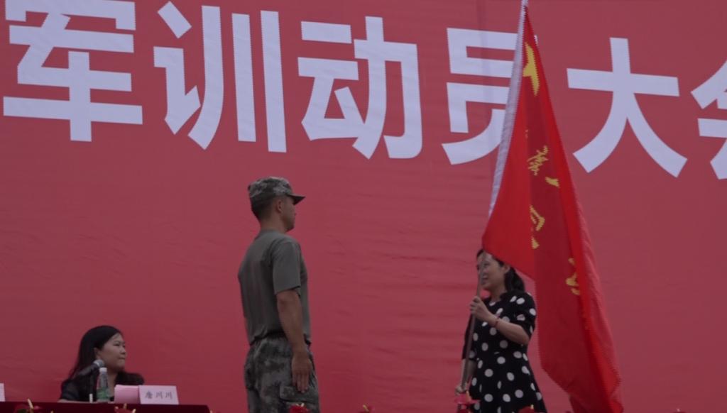 讲话结束后,柏群校长向军训团授旗,伴随着飘扬的旗帜,大会圆满结束。