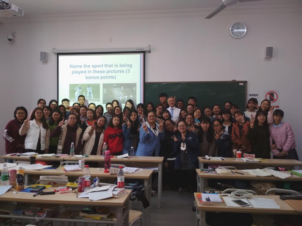 一开始,SeanHolmes教授的到来立即使课堂热闹起来。同学们对外教充满好奇的同时,更感慨于学校带给大家不可多得的“福利”。紧接着,Holmes教授向同学们介绍了布鲁内尔大学的历史和由来,以及其在全英国工程类专业里出类拔萃的地位。就英语口语交流方面,Holmes教授向同学们传授了如何在初次见面时给对方留下深刻印象的方式。在轻松愉快的氛围中,Holmes教授利用图片、视频、英语知识小测验等方式向同学们展示了英国全貌,让同学们领略了英伦文化和风土人情,提高了同学们学习英语的热情和兴趣。课上的交流互动瞬间拉近了师生距离,更让同学们在不同文化和思想的碰撞中感受中英思维的差异。