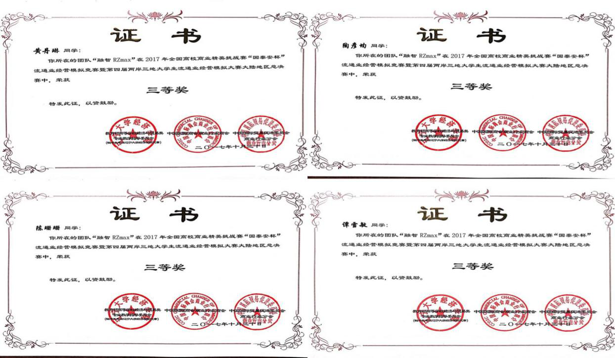 本次比赛从报名准备到大陆总决赛结束,历时6个月三个阶段:知识赛、大陆地区预选赛、大陆地区总决赛,经济学院共有12名学生参与知识赛,12名学生共3个团队参与大陆地区预选赛,最后2个团队挤进总决赛。来自15级贸经专业彭帅、魏佳路等同学的“融智eStar队”喜获全国二等奖;来自15级贸经专业黄丹琳、陶彦均等同学的“融智RZmax队”喜获全国三等奖。据悉,全国各高校参与此次比赛共计249个团队,这也是我校第一次参与流通业创新实践类大赛并获奖。