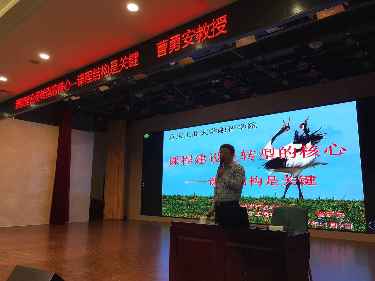 下午,曹勇安教授的讲座专题是《课程管理是转型的保障—创建学习型高校》。曹教授紧接着上午讲授的课程结构建设内容,进一步深入讲解课程管理的重要性。曹教授结合齐齐哈尔工程学院建设发展的实际案例,对人才培养目标、课程建设原则、如何转型发展等方面提出了自己独到的见解。并结合自身办学的实践经验,具体讲授了齐齐哈尔工程学院的具体课程管理与设计,分别具体到大学四年每一年每个阶段的校内学习与校外实习任务。在演讲过程中曹教授结合自身的丰富办学实践经验,鲜明生动的实践案例,阐述了当代高校办学的发展观与经营观,整个演讲现场气氛活跃,掌声如潮。