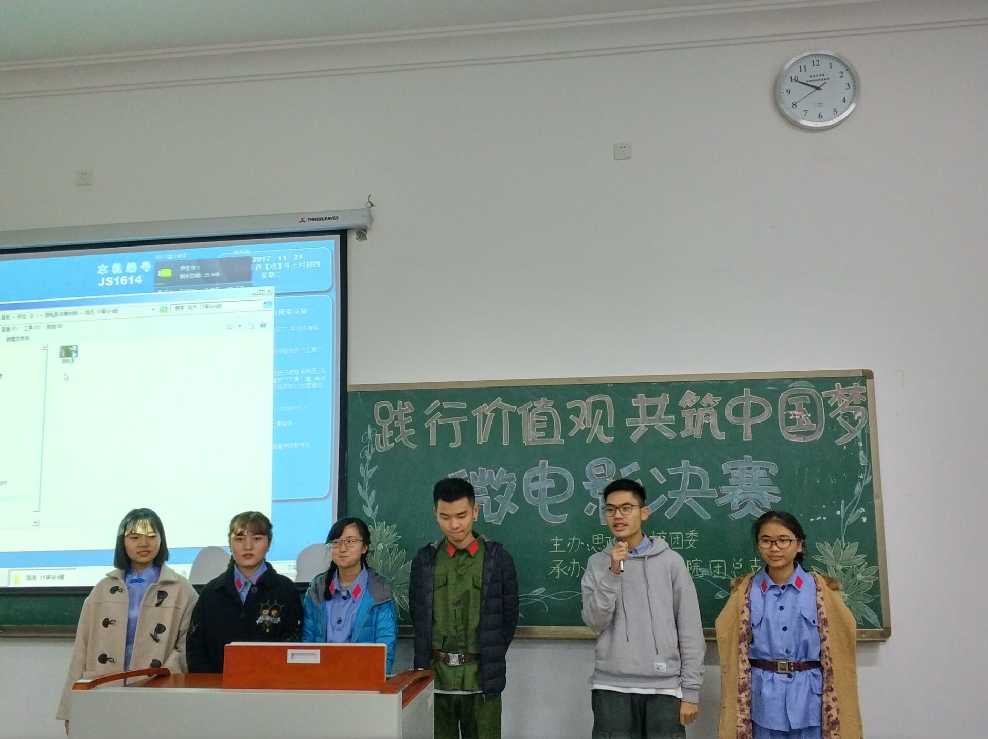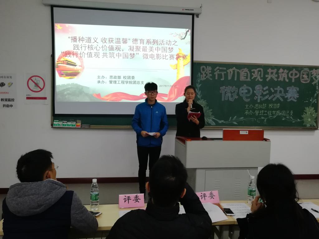 青年兴则国家兴,青年强则国家强,习总书记在中共十九大报告中对广大青年发出号召,在新时代的中国特色社会主义建设中,用中国梦激扬青春梦,在实现中华民族伟大复兴的征程中锐意进取、砥砺奋斗。为宣传贯彻党的十九大会议精神,响应习总书记的号召,1121日中午,由思政部、校团委主办,管理工程学院团总支承办的践行价值观,共筑中国梦微电影比赛决赛在教学楼1614教室举行。出席本次决赛的评委有思政部常晓薇主任、思修教研室主任周敏老师、思政部办公室主任刘璐静老师、党群工作部夏治禹老师、管理工程学院团总支副书记巩翰林;出席的嘉宾有校团委书记兼学生处副处长李刚老师、管理工程学院学团办主任范雪林老师。