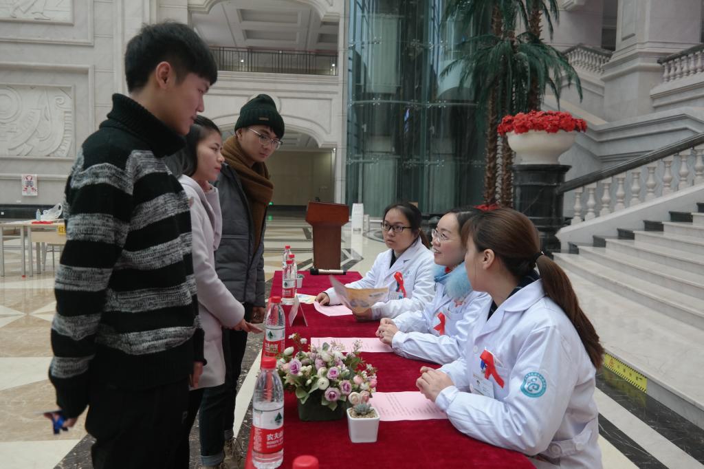 为认真贯彻落实党的十九大精神和推进健康中国建设的总体要求,全面实施《中国遏制与防治艾滋病“十三五”行动计划》,营造我校参与艾滋病防治工作的良好氛围,20171130,在第30个“世界艾滋病日”来临之际,我校大学生自我管理与服务委员会朋辈心理互助中心联合巴南区疾控中心、区人民医院在教学楼大厅开展了预防艾滋主题教育宣传活动。