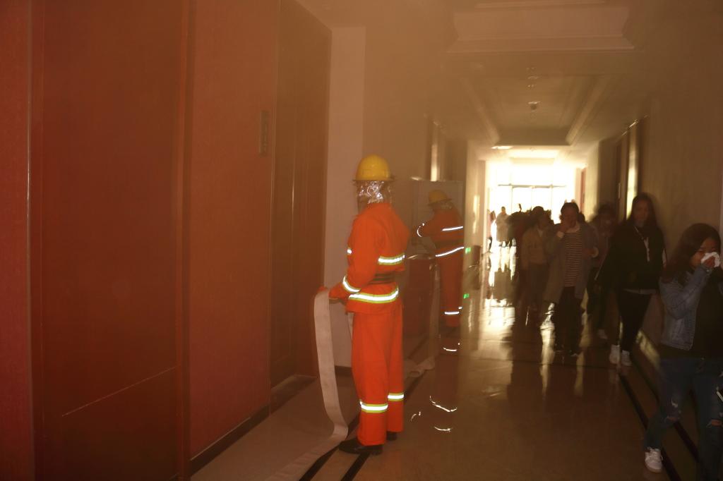 疏散演练之前,学校组织保卫处等部门进行了充足的准备,为保障演练的顺利、安全进行,组织成立的消防控制中心、后勤保障组、疏散引导组、医疗救护组等提前就位,随时待命;相关老师们也提前进入G5就位,准备协助同学们进行疏散。突然,只见浓浓烟雾开始迷漫于G5内外,警报立即响起,处于“失火现场”的同学们在“危急关头”并没有慌乱,迅速离开房间,在各层老师的协助下,有序、安全地撤离到了操场。学校还组织大家观摩了灭火演练,现场教授面临火灾时的脱险方法。