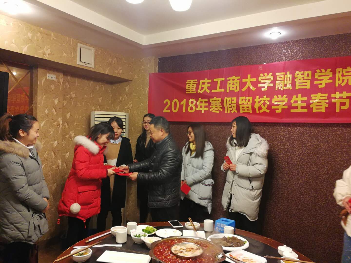 为关爱留校学生生活,2月12日,在学生处的精心安排下,所有留校学生欢聚一堂,参加重庆工商大学融智学院2018年寒假留校学生春节团拜会,陈龙国副书记出席并代表学校祝愿所有留校学生新春快乐,希望所有同学来年学业进步、身体健康,用优异的成绩为自己和学校的发展贡献力量。