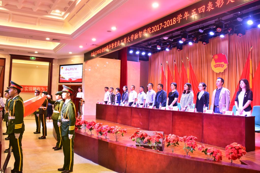 大会伊始,首先由国旗护卫队出旗,随着一声令下,国旗护卫队迈着铿锵有力的步伐,整齐划一地护旗前进。全体齐唱国歌后,党委陈龙国副书记随即宣读了共青团重庆工商大学融智学院委员会2017-2018学年度共青团表彰文件。紧接着,出席领导分别对获得先进集体和优秀个人的代表进行了颁奖,“共青团标兵”代表李松雪同学、“五四红旗团支部”代表查榆同学以及“五四红旗团总支”代表李兰老师也结合实际与心得体会分享了自己的成长经历,他们表示会继续发扬五四精神,为中华民族的伟大复兴添砖加瓦。