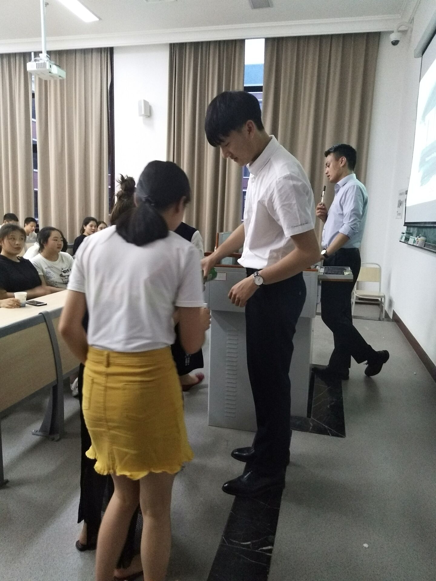 二十分钟后讲座进行到高潮;胡老师向大家讲到,韩国历史上的第一杯清酒可追溯到公元1300年前后。清酒,作为引入韩国重要文化元素之一,相比中国的白酒,度数都普遍较低,饮用后并不会有头疼的感觉。同时,韩老师还邀请了现场同学品尝了从韩国带来的各种口味的清酒,并依次作了简单介绍。体验清酒的文化底蕴,讲座在渐渐弥漫着清酒的清香中,推入高潮。
