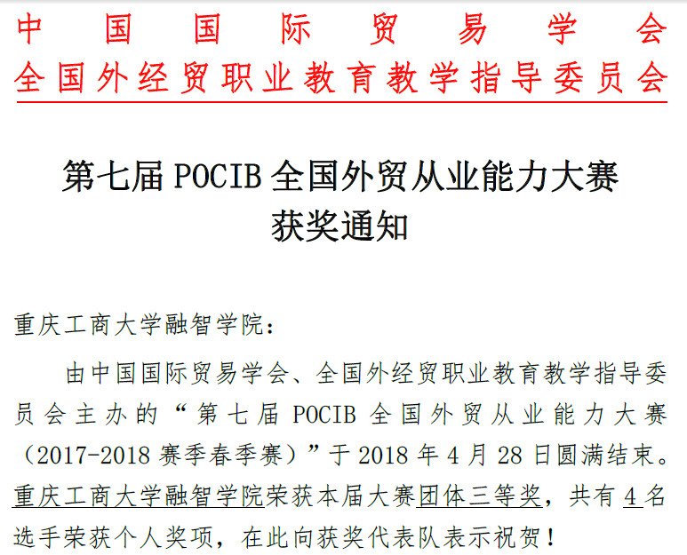 在刚刚落幕的第七届POCIB全国外贸从业能力大赛(春季赛) 中,我校商务学院选派的2015级国际经济与贸易及国际商务专业20名学生首次参赛,最终获得全国第四赛站团体三等奖,4名同学获得各参赛国家选手个人三等奖的佳绩。