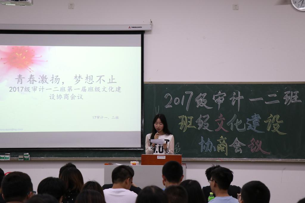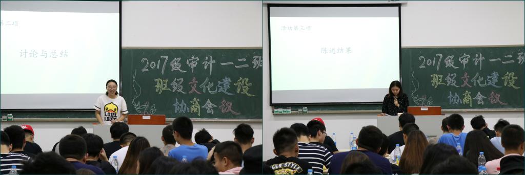 2018年6月3日晚19时,会计学院2017级审计学专业一、二班在1313教室召开了首届班级文化建设协商会议。本次会议从班级制度政策文化、班级团队协同文化、班级平台互联文化、班级竞技文化和班级智库文化等五个维度出发对班级文化建设进行了深入探讨,共形成5个大类15个小类成果。该专业一、二班辅导员游登贵老师和班级的100名学生参加了此次会议,会议由张晓洁同学主持。