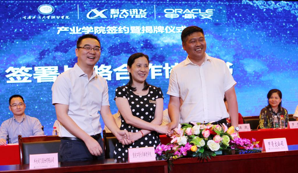 为了培养更多服务重庆区域经济发展需要的大数据智能化专业人才,我校和目前亚太地区最大的人工智能上市公司——科大讯飞股份有限公司以及全球最大的信息管理软件及服务商——甲骨文(中国)软件系统公司签订战略合作协议,成立融智讯飞人工智能学院和甲骨文大数据学院,共同培育大数据智能化人才。以此次签约及揭牌仪式为契机,未来校企双方将在应用型人才培养、科学研究、产学研师资团队建设、专业建设等领域以及大数据研究中心、人工智能专业实验室、人才鉴定中心等教学、科研、人才鉴定平台建设方面形成合力,多角度、多层次的开展校企合作,深化产教融合。两大企业巨头与我校强强联合,互利共赢,前景广阔。