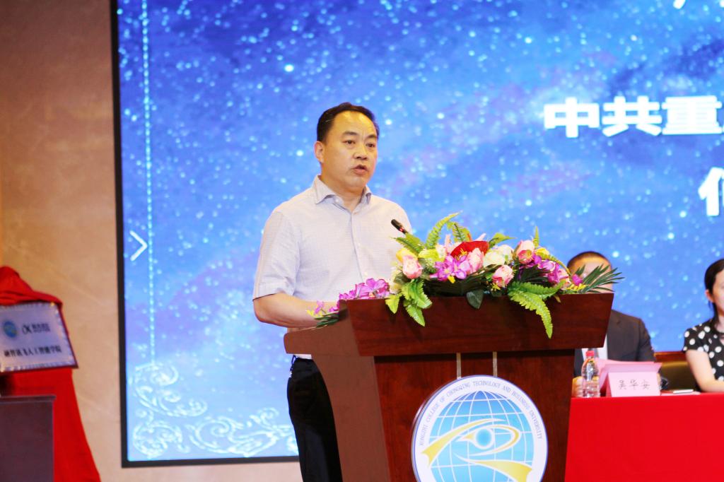 重庆市教育委员会高教处副处长吴岚代表市教委对两个产业学院的成立表示祝贺,吴处长指出,市教委将大力支持融智讯飞人工智能学院、甲骨文大数据学院的发展,大力支持我校的发展,大力支持科大讯飞和甲骨文公司在重庆教育领域的发展。并提出了“做实、做精、做亮”的三点希望,希望校企双方以更加开放的胸怀,携手同行,精诚合作,整合优化资源,在校企合作方面大胆探索,勇于创新,深化合作的形式和内容,不浮于表面,不流于形式,不搞花架子、面子工程,真正将学院做实;希望校企双方以学生为中心,在人才培养方案、课程建设、教材建设、师资培养、实习实训、过程管理等方面加大探索力度,共同研究制定科学的切实可行的方案和措施,把育人的各个环节做细做精,不断提高育人水平;希望校企双方共同努力,把两个学院建成学校最具特色、最有魅力、充满活力的新型二级学院,成为重庆应用型大数据智能化人才的培养基地和技术创新基地,形成在全市范围内可复制、可借鉴的经验,助推经济社会发展。