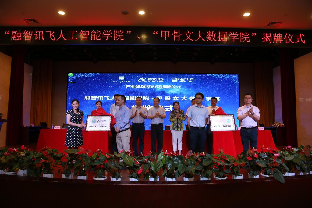 在仪式上,三方代表签署了校企合作共建协议,并在嘉宾的见证下为“融智讯飞人工智能学院”、“甲骨文大数据学院”揭牌。