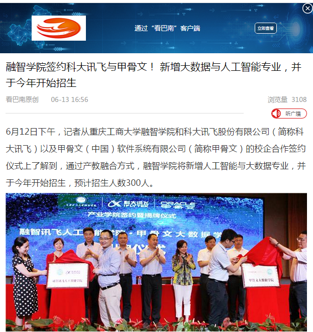 6、看巴南 《融智学院签约科大讯飞与甲骨文! 新增大数据与人工智能专业,并于今年开始招生》