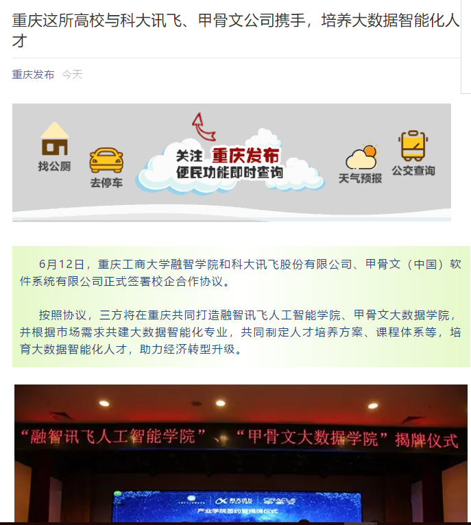 3、重庆发布 《重庆这所高校与科大讯飞、甲骨文公司携手,培养大数据智能化人才》