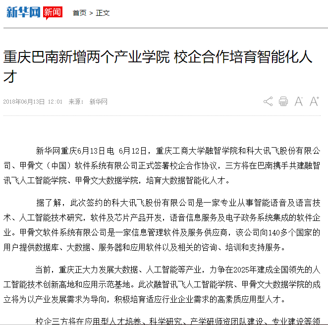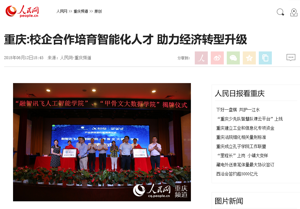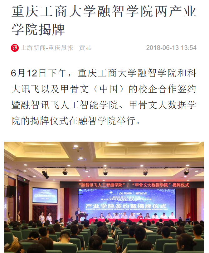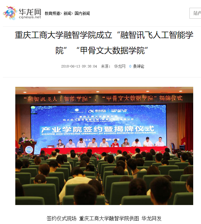 5 华龙网 《重庆工商大学融智学院成立“融智讯飞人工智能学院”“甲骨文大数据学院”》http://education.cqnews.net/html/2018-06/13/content_44474377.htm