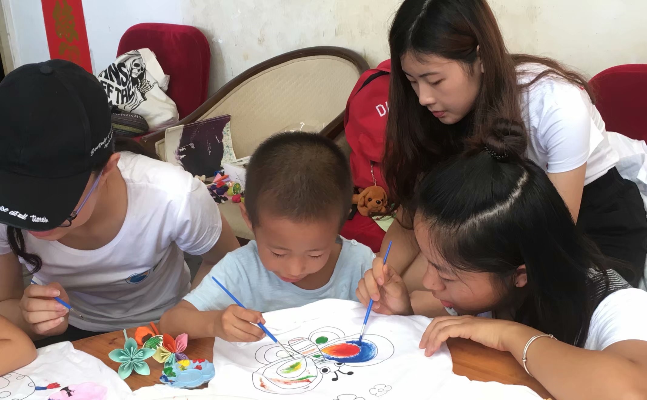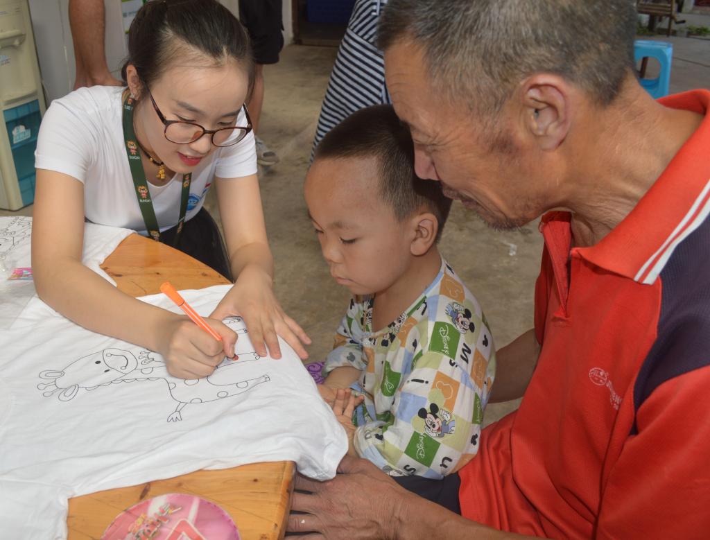 活动现场,服务团的志愿者们和小朋友们热情高涨,以两人一组的形式进行绘画以及T恤涂鸦的趣味课堂。每个小朋友在志愿者的引导下都充分发挥自己的动手能力与想象力,用稚嫩的双手画出一幅幅最纯真的图画。
