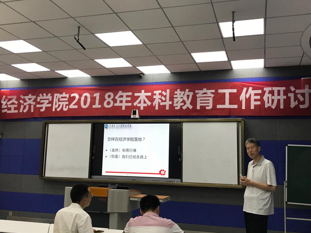 研讨会分为两个阶段,第一阶段丁广龙书记向与会人员传达了新时代全国高等学校本科教育工作的会议精神,并结合经济学院的具体情况对经济学院向应用型转型提出了建议。第二阶段刘成杰教授对陈宝生部长在新时代全国高等本科教育工作会议上的讲话进行了深入解读。刘教授首先对3次高等学校教学、教育工作会议进行了梳理,以“本科教学”到“本科教育”一字的变化为主线,指出此次本科教育工作会议对新时代中国的高等教育具有划时代的意义,既深化了对高等教育的认识,也拓展了新时代高等教育的内涵。其次从“以本为本”和“四个回归”两个基本点并结合学院特色进行解析,强调如何让会议精神在经济学院落地。最后指出知易行难,但我们已经在路上,要把经济学院本科建设搞好需要各方面的共同努力,老师们要发挥好“战斗员”的关键作用,投入足够的精力、投入足够的时间,潜心教书育人、花大力气下大功夫培养好德才兼备的时代新人。