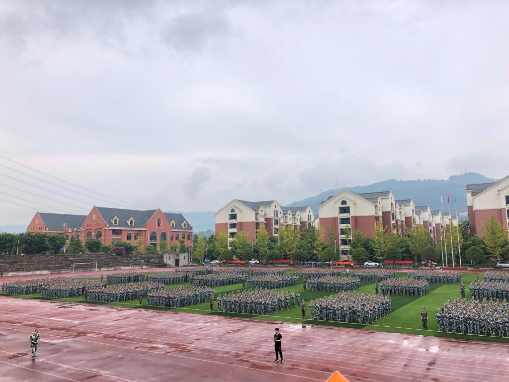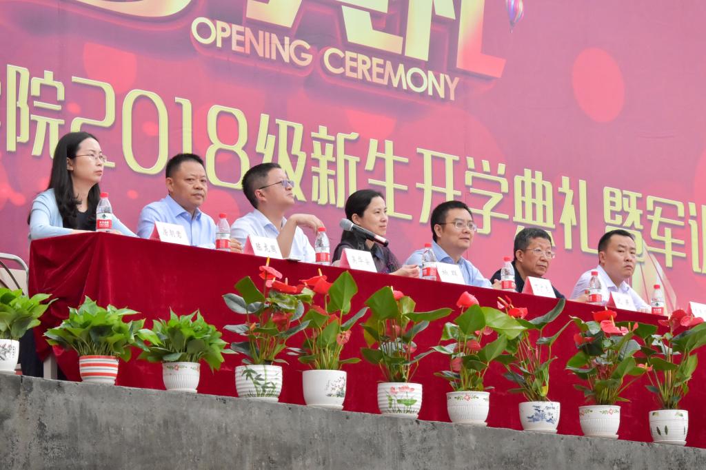 2018年9月8日,重庆工商大学融智学院2018级新生开学典礼暨军训动员大会在操场如期举行。重庆工商大学副校长兼融智学院校长柏群,校党委书记丁广龙,校党委副书记兼军训团政委陈龙国,副校长兼大会主持吴华安,副校长沈民,校长助理房朝君和李春雷,巴南区人武部正营职参谋、军训团团长范伟,军训团参谋长兼总教官刘敏及其他军训教官、2018级全体新生及辅导员,参加了此次开学典礼暨动员大会。