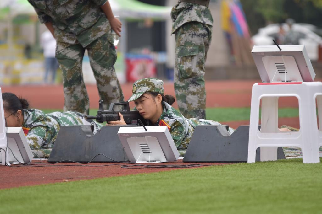 军训的第五天,新生们有机会接触到心心念念的打靶训练。教官示范时,一拿起枪,整个人的气势就不一样了,这大概是军人的天性吧,一碰到枪,整个人聚精会神,眼神像极了凶猛的豹子,随时蓄势待发。但是为了能让新生们更好的理解,教官选择了幽默风趣的语言:“来,你们模仿一下我,但你们不能超越我”。