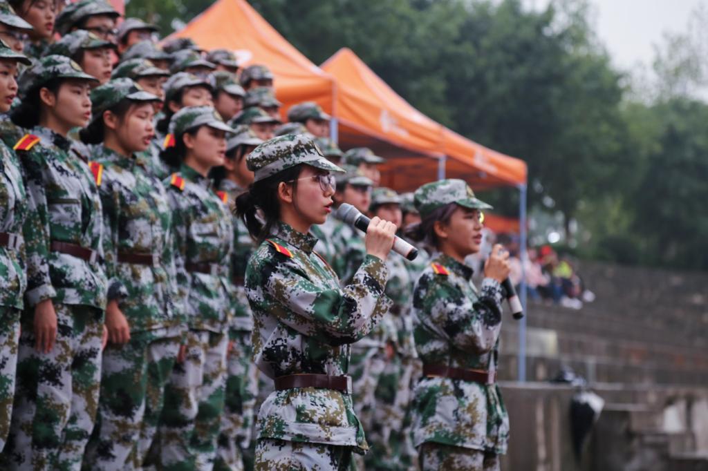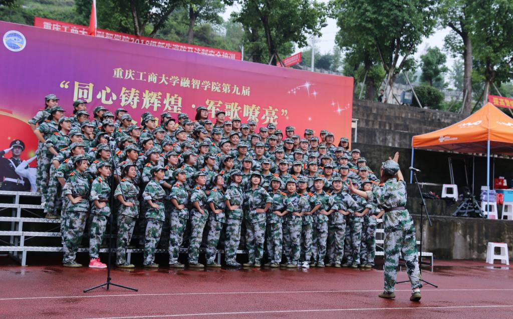 各连在操场上使出浑身解数将自己准备的歌曲展现出来,豪迈唱出军营生活的无限风采,严明的纪律、严整的军容展现了这十几天军训来的丰硕成果。30个连参加比赛只有个10连进入决赛,在决赛场上有女生连唱的«女兵谣»体现出巾帼不让须眉的英姿,有男生连«歌唱祖国»的雄心壮志,各展身手,豆大的雨水打在身上也不能浇灭同学们的热情。同心铸辉煌,以诗的语言配以优美旋律来表达融智情感,是融智精神文化教育与传承的方式之一。