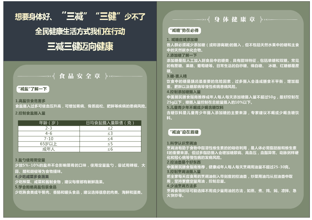 此次“三减三健,迈向健康”主题宣传活动共开展包括主题班会、发放宣传手册、播放宣传视频三个部分。其中“三减”为减油、减盐、减糖,“三健”为健康体重、健康口腔、健康骨骼。随着生活条件的不断改变,大多数人的生活方式出现问题。通过此次系列活动的开展,我校学子对食品安全和身体健康方面的知识有了更加深刻的了解。