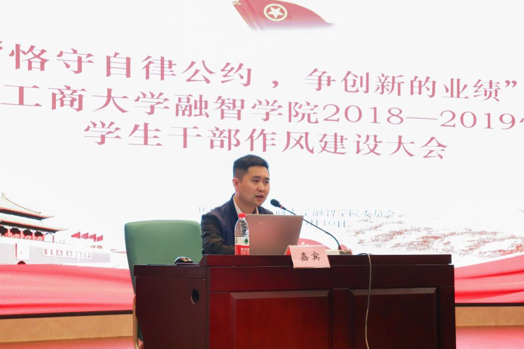 “恪守自律公约,争创新的业绩”。2018年10月10日中午12点,重庆工商大学融智学院2018-2019学年学生干部作风建设大会顺利召开。大会的主要目的是增强学生干部的纪律意识、大局意识、担当意识、奉献意识,让学生干部起到模范带头作用,旨在服务同学、团结同学,当好桥梁。此次学生干部作风建设大会由校团委书记李刚老师担任主讲人。
