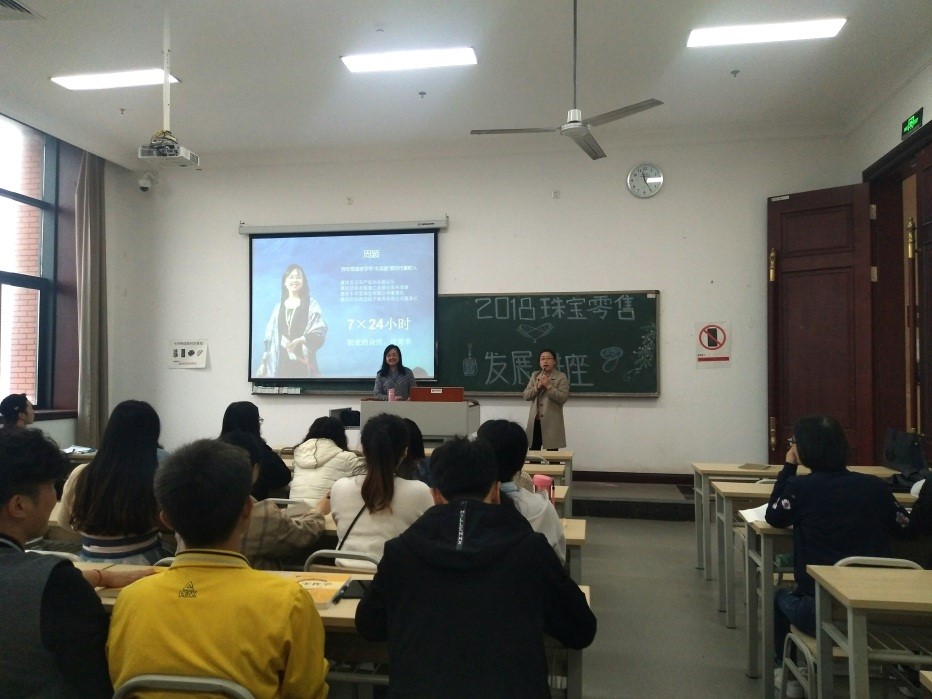 周颖少堂主讲座分为两个部分。首先,她从消费升级下珠宝零售业的发展现状、大数据支持下的珠宝零售企业变革、珠宝零售企业全渠道营销之路以及珠宝零售业需要的人才四个方面进行了讲解,讲座现场气氛活跃。然后,她分享了自己从事珠宝零售的人生经历,并激励同学在校期间要多读书、读好书。