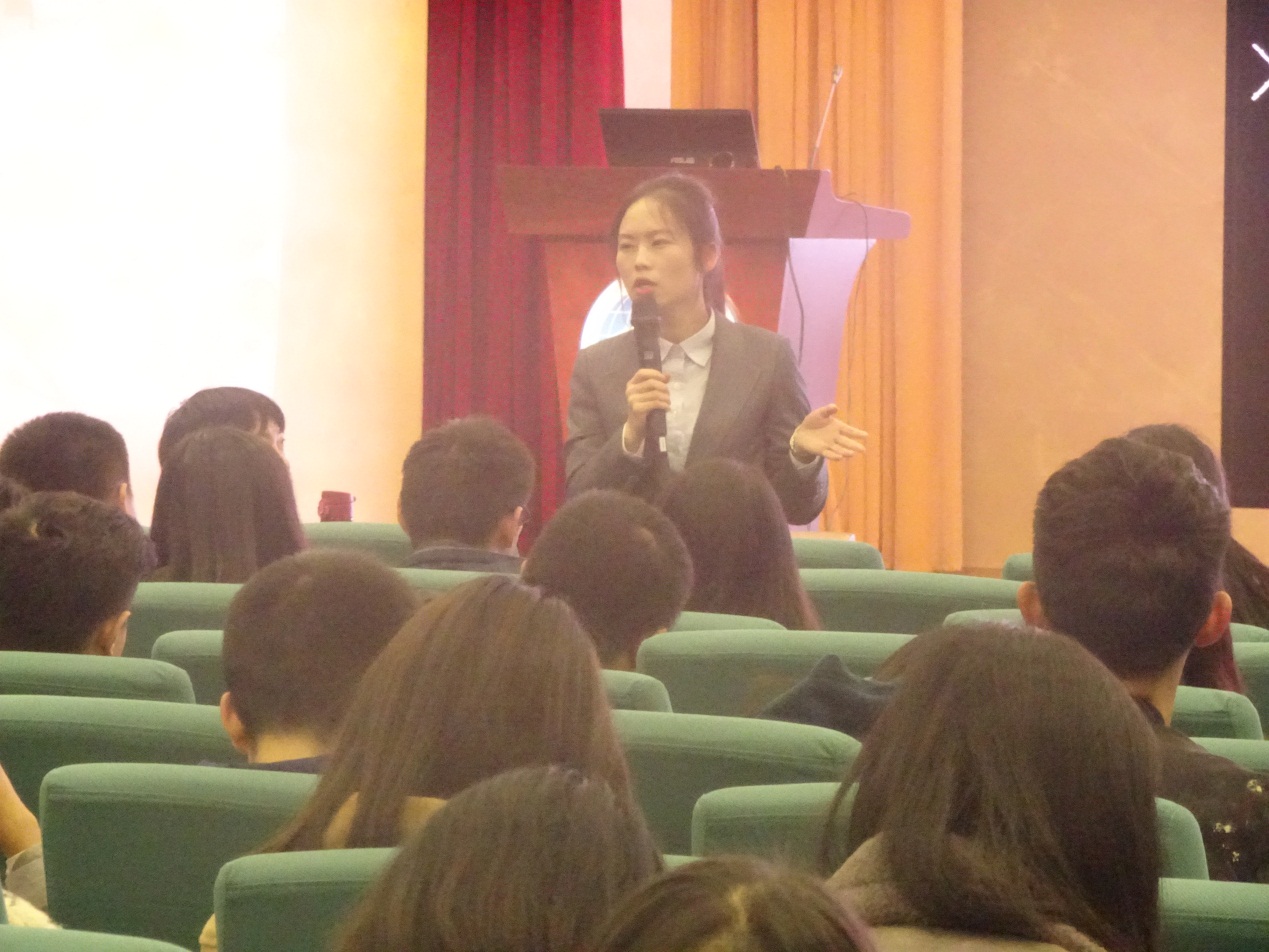大会伊始,陈萍书记上台致词,首先对再次回到母校分享她们成长故事的两位学姐表示热烈的欢迎,然后介绍了举办本次分享会的目的,并希望在场的同学们能够从别人的成长故事中有所领悟,找好目标和方向。接着,刁玲学姐向大家分享了自己在工作中的成长经历。她在2011年进入中国平安人寿保险股份有限公司,在短短7年内从一个小职员“蜕变”为平安人寿保险公司重庆分公司的一名总监,这和她的努力是分不开的。学姐告诉台下的学弟学妹们很多进入职场才能懂得的道理,比如说:职场中的逆商很重要、人生的选择很重要、人生一定要有目标和“贵人理论”。学姐着重强调了目标的重要性,学姐在毕业的七年里买车、买房、投资、年入百万都是因为心中有目标,并且为目标而不懈努力奋斗。学姐最后送给在场的所有人一句话:“得到的远比你想象的还多,有欲望才会撑大你的野心。”
