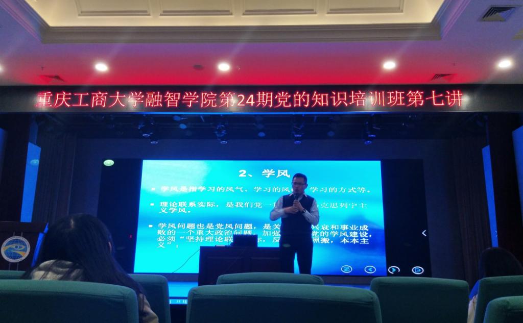 11月9日中午12:40,重庆工商大学融智学院第24期党的知识培训班第七讲在学术报告厅进行。重庆房地产职业学院副院长李果老师为全体学员讲授了“党的作风建设”这一专题。