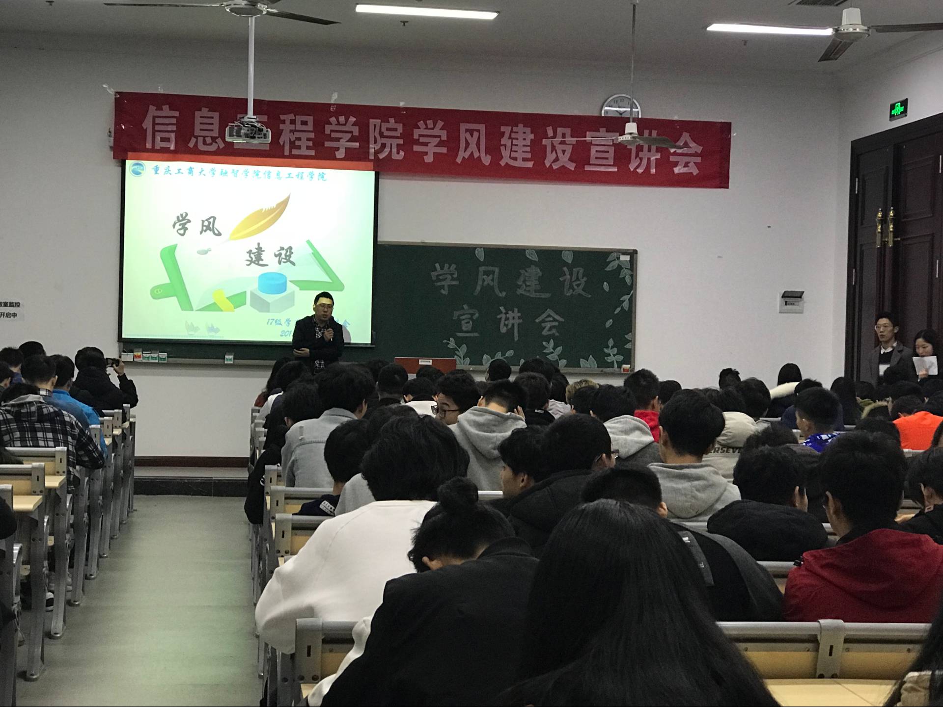 继信息工程学院1113日“学风建设动员会”之后,20181119日晚,重庆工商大学融智学院信息工程学院学17级学风建设宣讲会在1420教室顺利开展。本次宣讲会是在学院党总支叶远帆副书记“狠抓学风,建设学习新环境,打造学风新生态”的背景下开展的。信息工程学院全学院综合布置与安排,力使信息工程学院学风建设上一个新台阶。