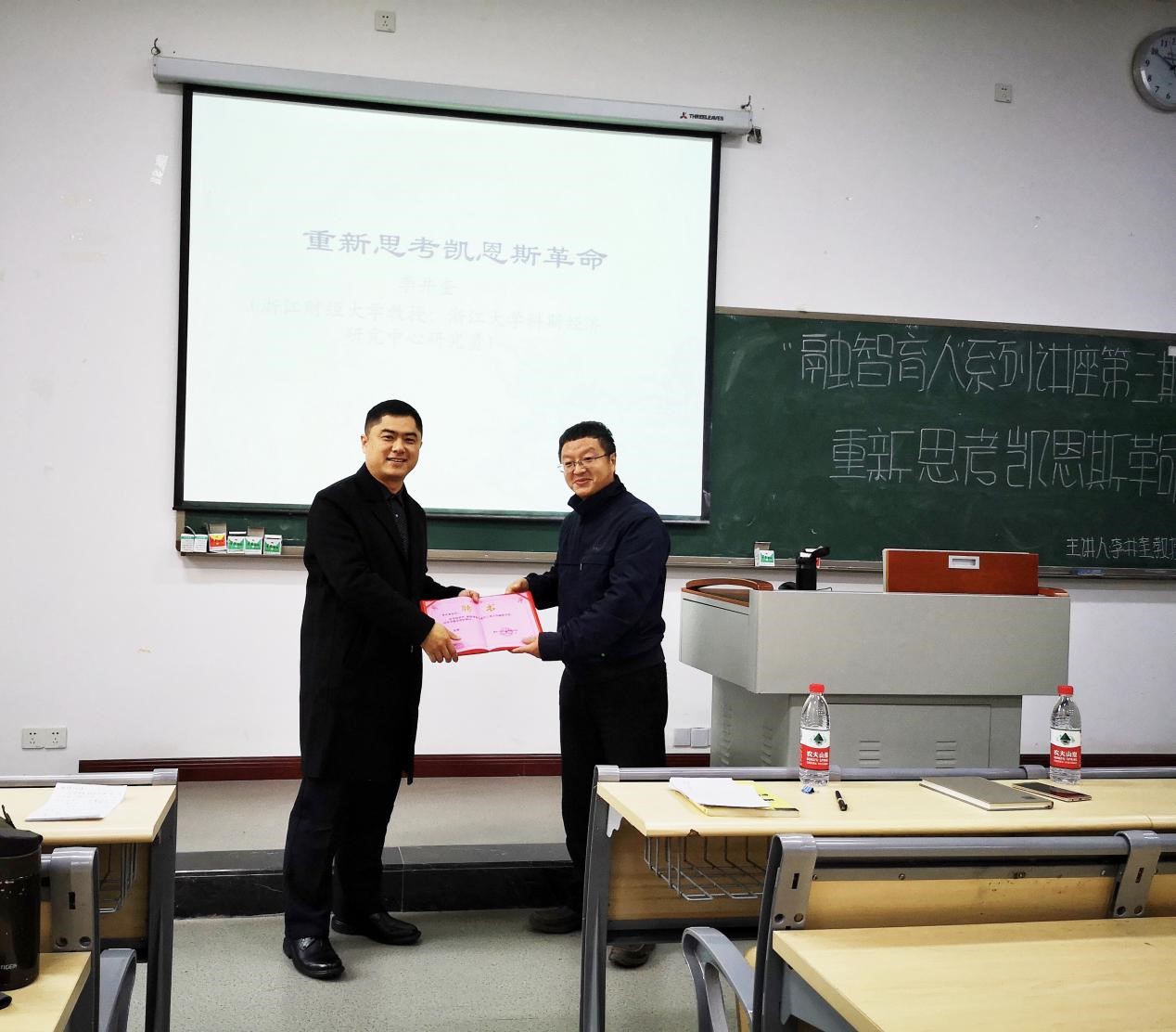 2018年11月22日,受经济学教学团队首席教授李政军教授的邀请,浙江大学西方经济学博士、浙江财经大学经济学院教授、浙江大学科斯经济学院研究中心研究员、浙江省高校优秀教师李井奎教授莅临我校,他以凯恩斯理论为主题,先后为我校师生及经济学教学团队成员带来两场精彩的讲座。上午的讲座(“融智育人”系列讲座第三期)标题是:重新思考凯恩斯革命,该讲座面向全校师生,以知识性和趣味性为主,在1420教室举行;下午的讲座(“融智育人”系列讲座第四期)标题是:凯恩斯的复仇-现代宏观经济学的困境,该讲座主要面向经济学教学团队的老师,在1220教室举行。 两场讲座均由李政军教授主持。