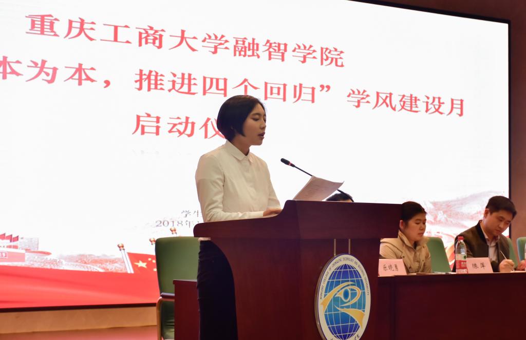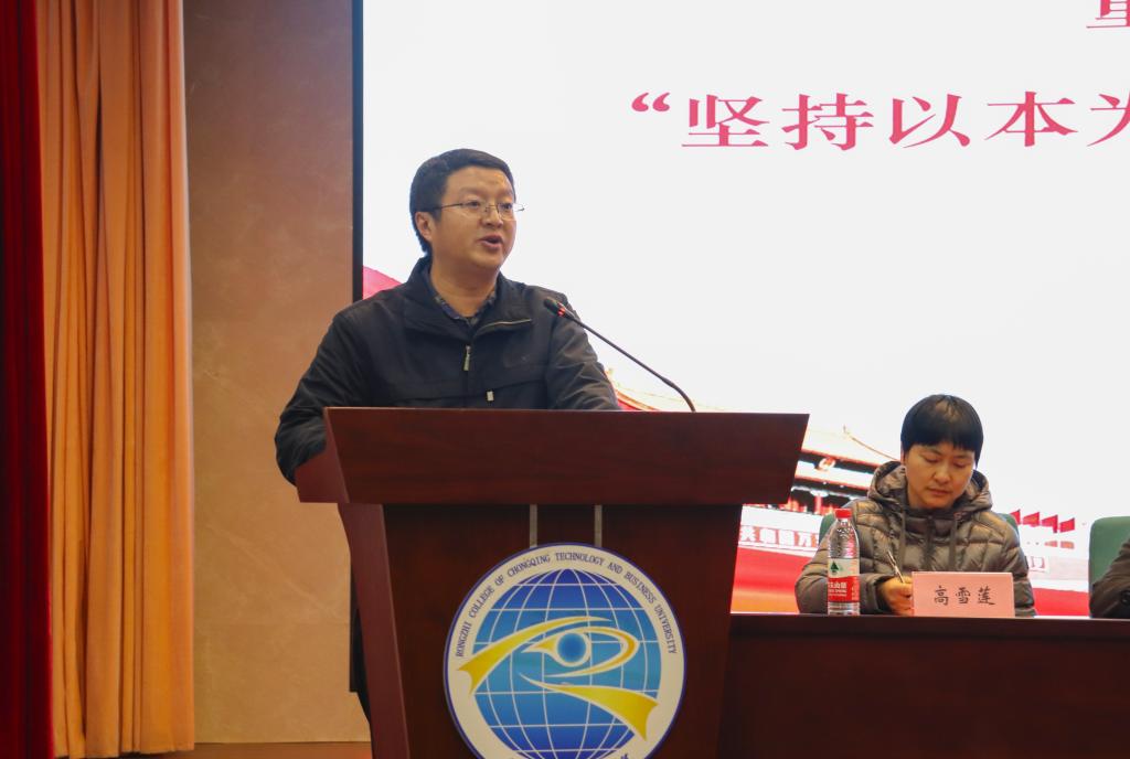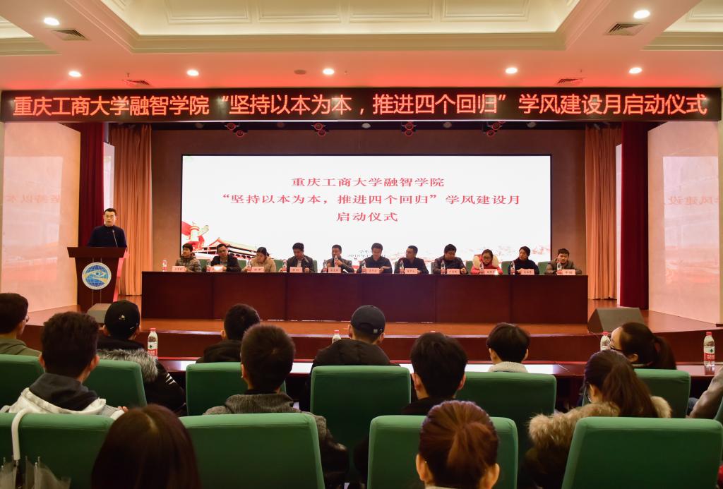 为深入贯彻落实新时代全国高等学校本科教育工作会议精神,全面提升我校教学水平和人才培养质量,促进教育教学工作开展。我校于12月6日下午18:30在教学楼学术报告厅顺利举行了“坚持以本为本,推进四个回归”学风建设活动启动仪式。出席本次活动领导有:重庆工商大学融智学院副校长吴华安、党委副书记陈龙国、教务处处长崔中山、各学院党总支副书记、专职辅导员、各学生组织主席团、各班学习委员以及2018级学生代表。本次启动仪式由学生处副处长李刚主持。