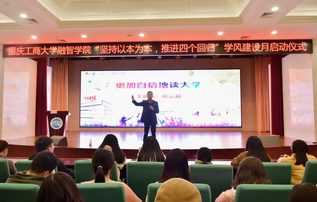 至此,“坚持以本为本,推进四个回归”学生建设活动启动仪式圆满结束,在启动仪式后,我们也有幸邀请到来自重庆工商大学的陈运超副校长为学生们进行了以“更加自信地读大学”为主题的讲座。 陈运超副校长针对学生在大学时期存在的迷茫和不自信两大烦恼展开了讲话。他阐述了从高中到大学的两个表层变化分别是老师”不见了”和同学“变了”,具体分析了老师不见的两大原因并进行了深入挖掘,一是大学是青春的最后一站,这就意味着学生们要独立面对世界,实现“断奶”。二是老师之间互不认识且老师们颇有专业精神,更看重自己的个人研究使得他们更加忙碌。同时,他阐述了同学的两个变化,一是大学同学目标多样化,二是来源多样化,另外还结合了新东方创始人俞敏洪的实例向同学们证明了同学之间因为不同从而变得更加有文明人的素养。在讲话的最后,陈运超副校长结合融智的学子提出三点建议:多阅读、多练习、多交往。