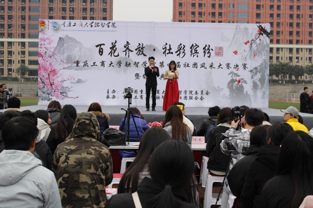 白日不到处,青春恰自来。2018年12月12日中午12:20,社团联合会第四届“百花齐放•社彩缤纷”社团风采大赛决赛暨颁奖典礼在学校足球场顺利举行。本次大赛由共青团重庆工商大学融智学院委员会主办,由重庆工商大学融智学院社团联合会承办。莅临本次大赛的嘉宾有:学生处处长唐川川老师,学生处副处长兼团委书记李刚老师,财富管理学院学团办主任宋钰静老师,商务学院学团办主任徐繁生老师,管理工程学院综合办主任范雪林老师,学生处王玲艳老师,学生处杨惠林老师,学生处李英老师,团委刘艳娇老师以及团委郑旺老师。校社团联合会主席团担任本次大赛的评委。14个晋级的社团在本次决赛中展开了激烈地比拼,校团委、学生会主席团代表、各学院主席团代表、28个社团代表,近300名观众观看了本次大赛。